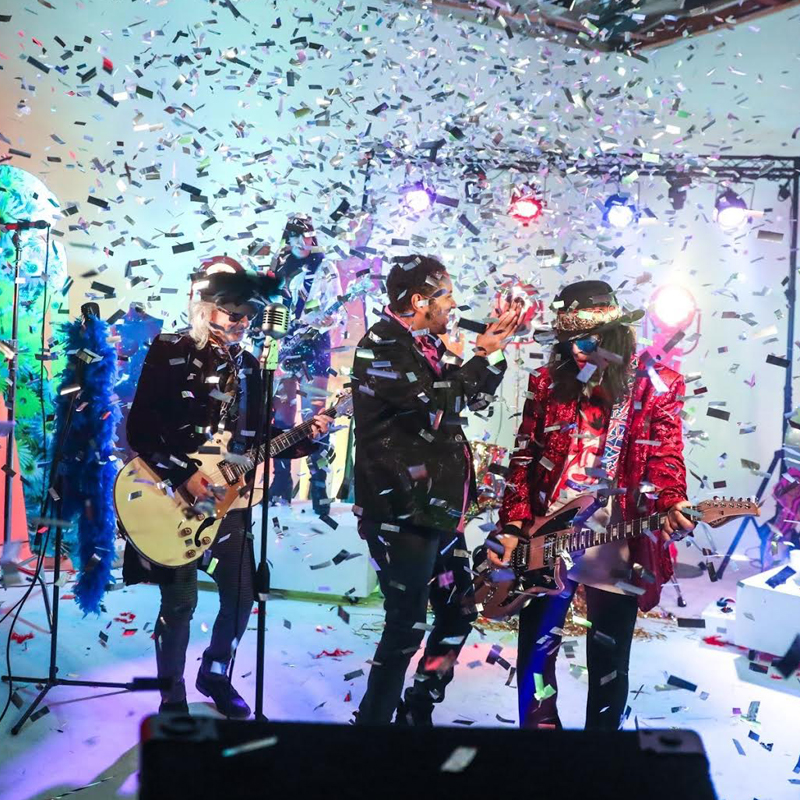 Ciravolo adds, “Tish and I were just laughing last night how we used to listen to the Mission when we first started dating then fast forward 20 years and we are clothes shopping with Wayne Hussey at Iguana for the shoot. Life is an amazing thing! I love the end of the video when we all switch around on instruments; that was all Wayne’s idea and I think it just adds to the feel of fun and celebration! The confetti cannons sure made a big mess! I’m glad the wonderful people at Tiger Labe Studios like us!!! There is a classic moment in the video where Rolan first sees the ‘horse head guy’ (who also makes an appearance in our ‘Look Up’ video). His look is priceless! After it was all done, having Rolan thank ME for having him involved and that his father would really like this was beyond amazing. Seeing Wayne grin ear-to-ear through the video is pretty cool too.”