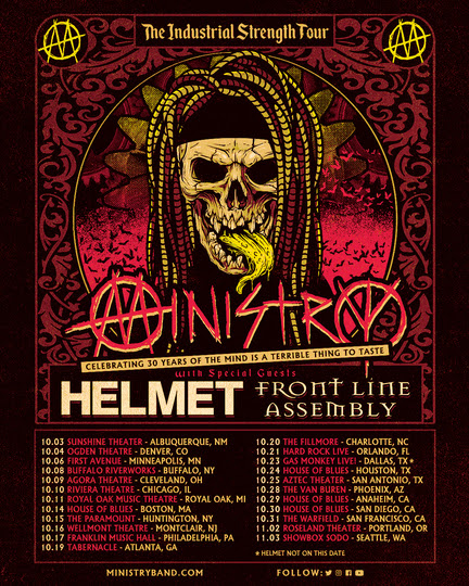 The Industrial Strength Tour kicks off October 3, 2021 in Albuquerque and will run through November 3, 2021 in Seattle with many dates quickly selling out. The night will include special guests Helmet and Front Line Assembly for this one-of-a-kind celebration that honors not only the 40th anniversary of Ministry in 2021 but also the 30th anniversary of revolutionary album The Mind Is A Terrible Thing To Taste.